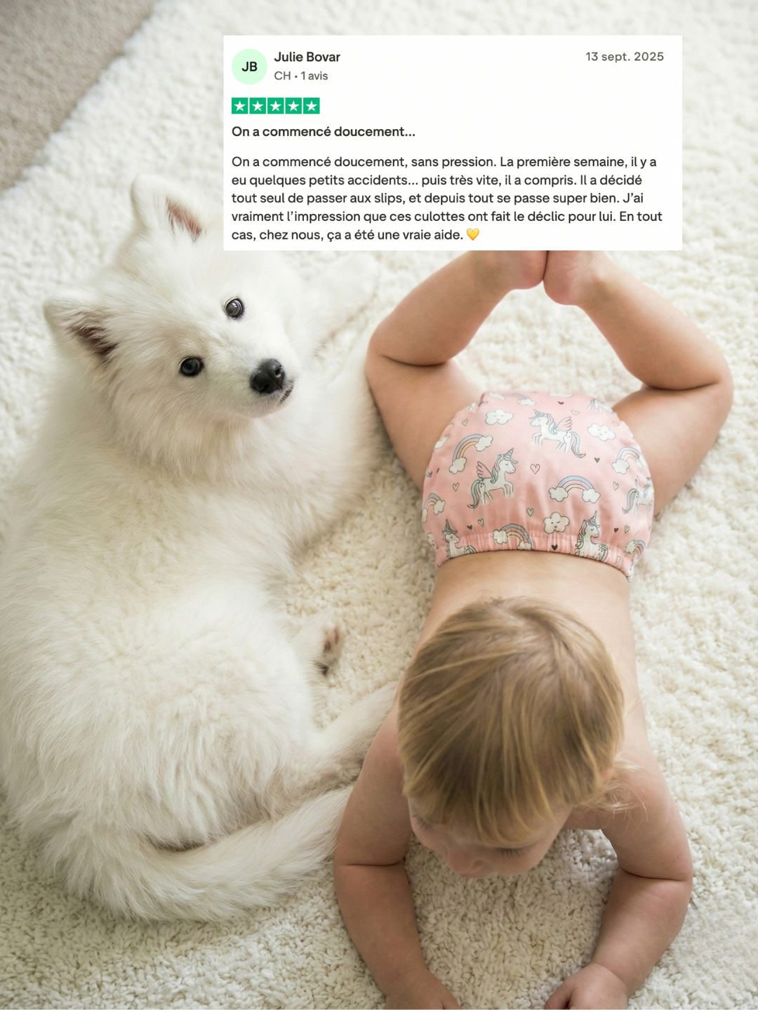 Le résultat ? Une transition naturelle et rassurante. Votre enfant reste au propre aux yeux du monde, mais apprend à son rythme le chemin vers la propreté.